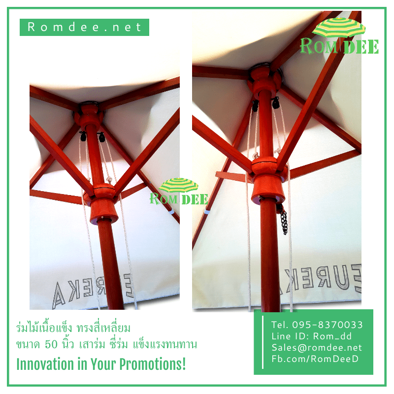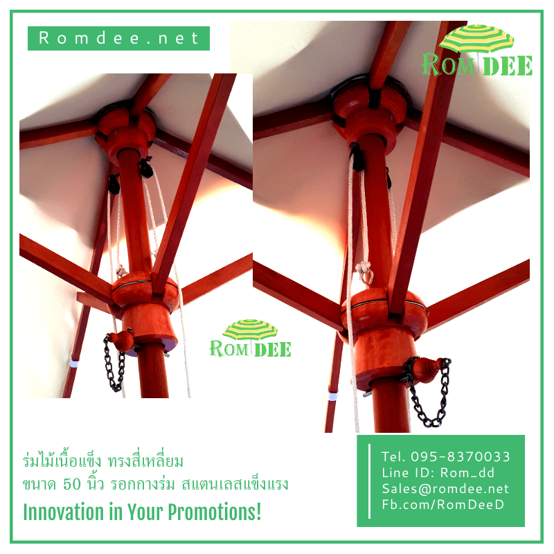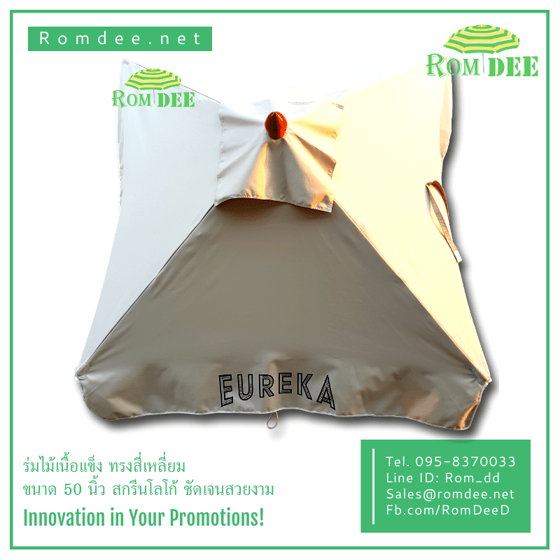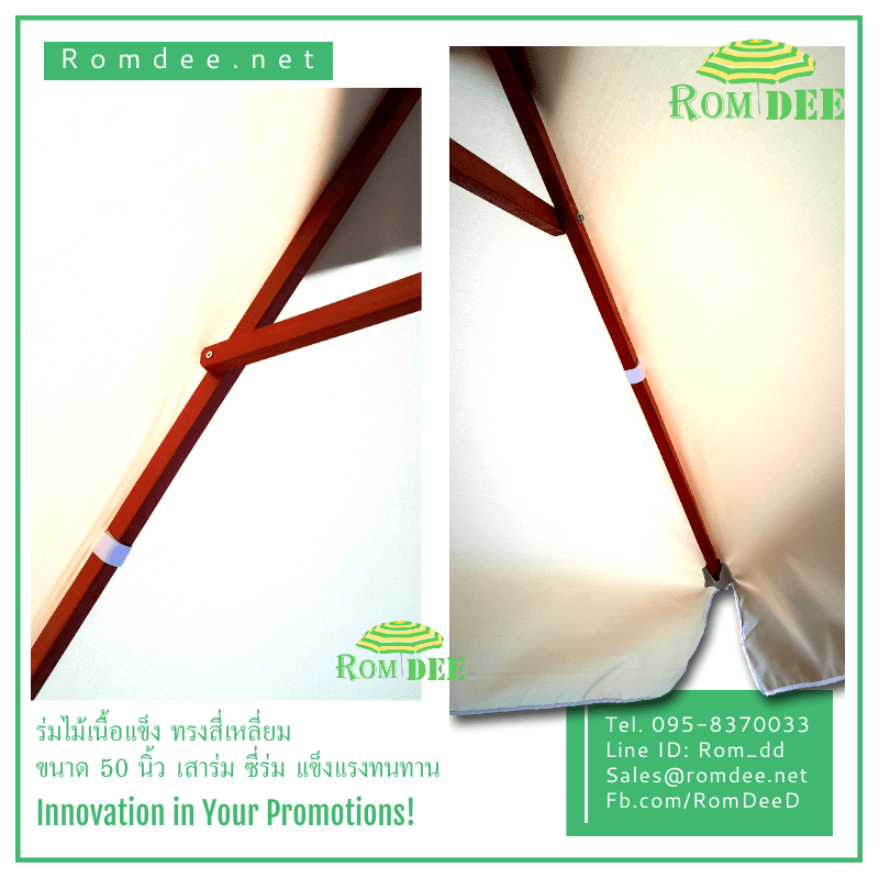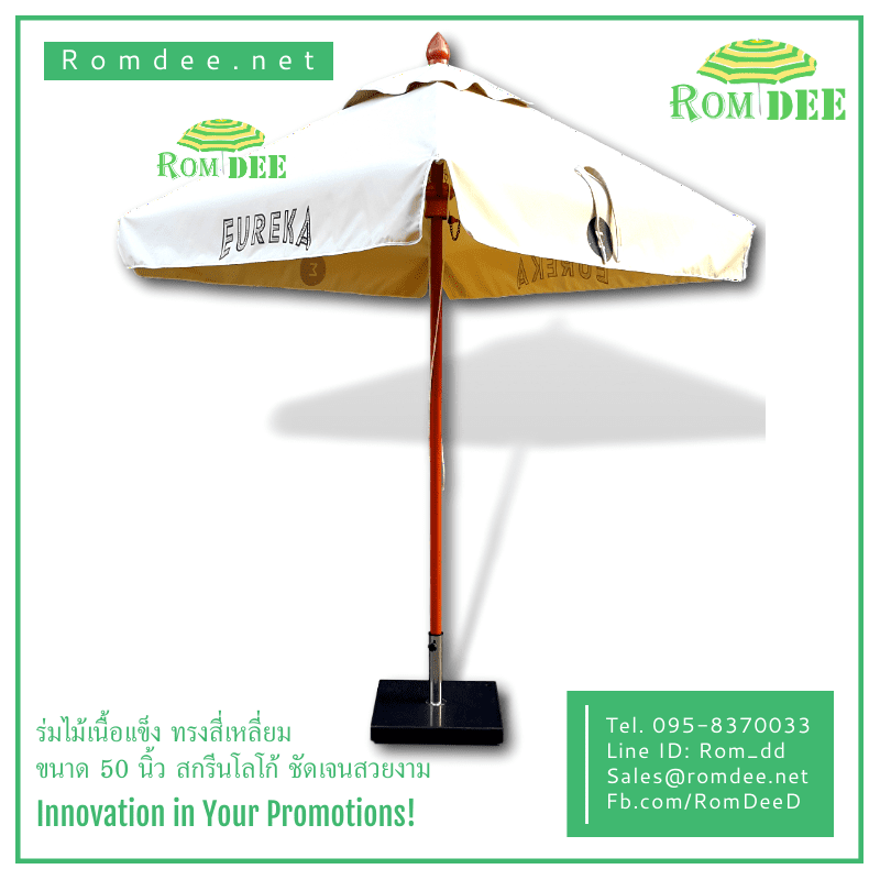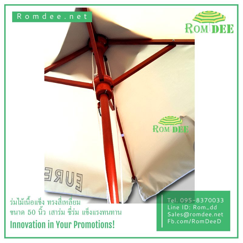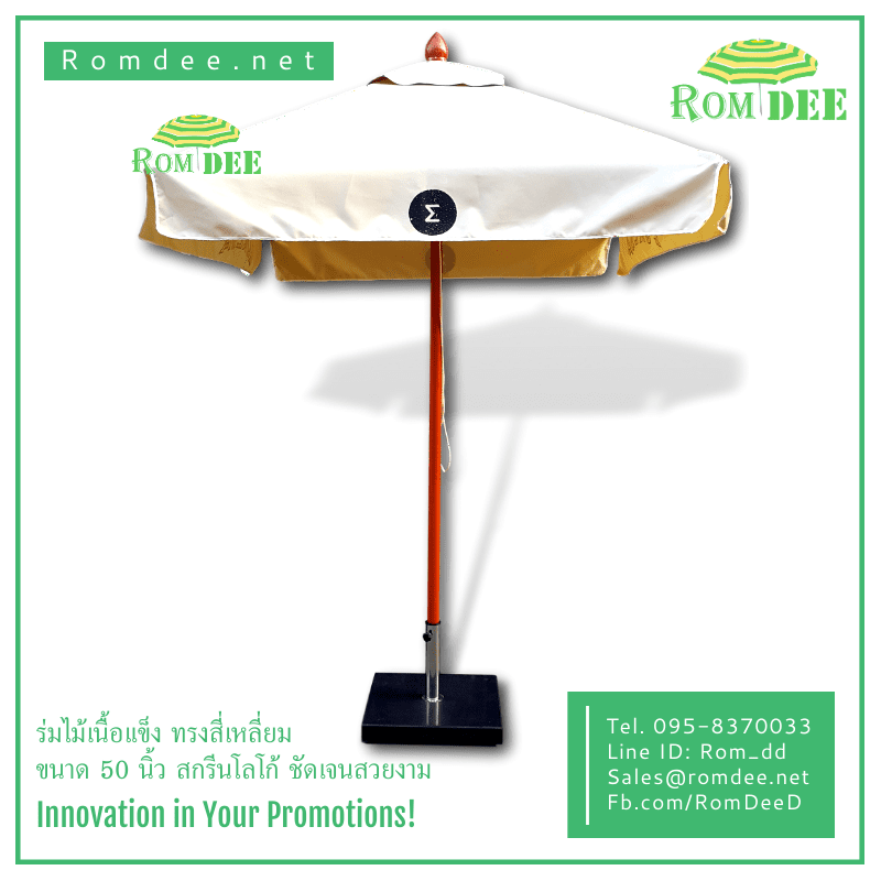 ร่มไม้เนื้อแข็ง ทรงสี่เหลี่ยม ขนาด 50 นิ้ว สั่งทำ สั่งผลิต ราคาถูก ราคาส่ง สกรีนโลโก้สวยงาม ทำให้ร่มดูหรูหรา น่าสนใจเป็นอย่างยิ่ง ผ้าร่มอย่างดี เหมาะอย่างยิ่งต่อการสร้าง Brand Awareness ร่มสระว่ายน้ํา ร่มรีสอร์ท ร่มโรงแรม ร่มสนามไม้เนื้อแข็ง